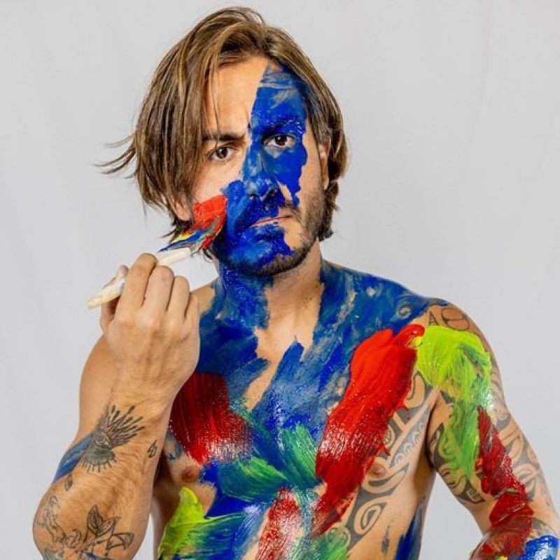 New model arrive with Paco, a tattoed guy who love art and drawing and decide to do this messy session where he covered his whole body in paint wearing only tigh spandex shorts.
